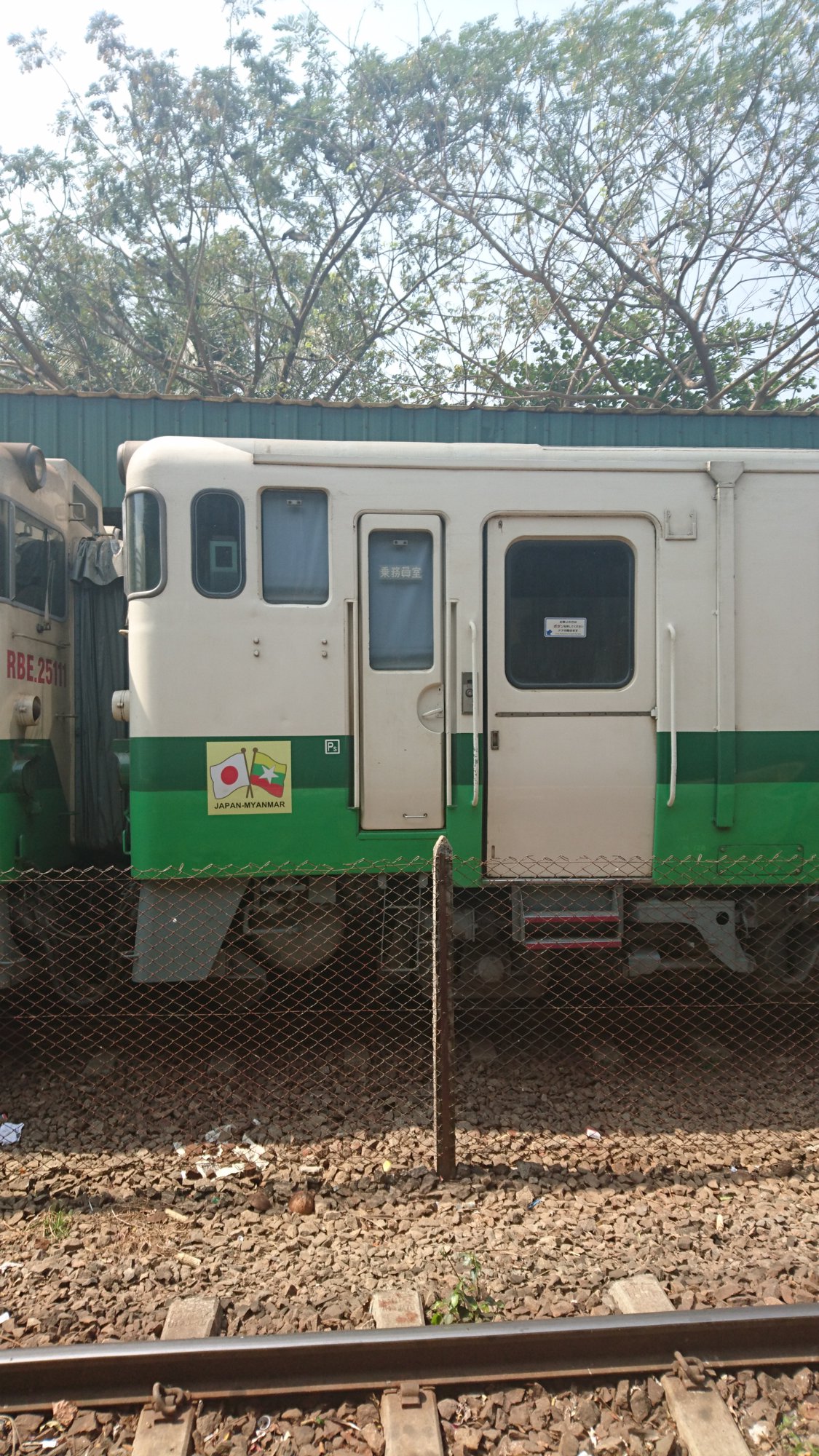 ミャンマー・ヤンゴンのの環状線では木造客車の やばそうなタイプの車両と、 日本からの譲渡車両っぽい比較的現代的な車両が走っている。 こちらは日本からの譲渡車両。 ネットで調べた感じだとキハ40っぽい。